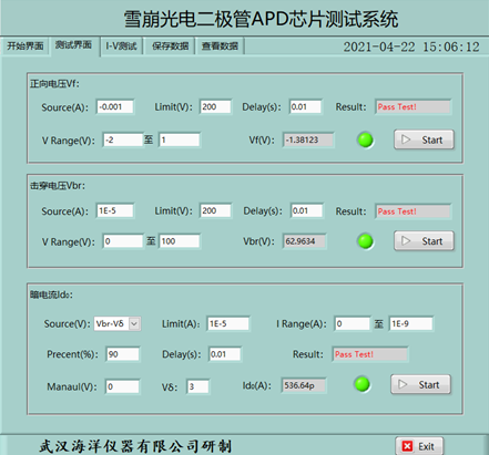WHOI APD測試系統是我公司完全自主研發而成,搭載我司研發的手動耦光平臺以及APD芯片測試板,實現了雪崩光電二極管芯片的擊穿電壓、暗電流、正向電壓、響應度、倍增因子、量子效率以及無光、有光狀態下對APD芯片進行I-V曲線的自動測試和合格判定。
