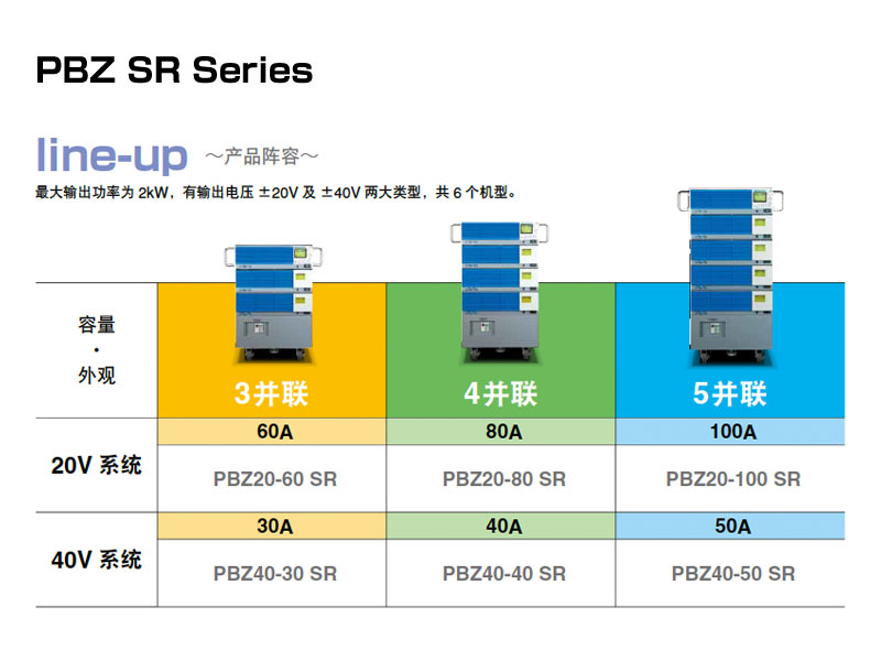 | PBZ40-50 SR | PBZ(SR) 系列是在輸出端無正負極極性切換,而連續通過0點,正負極雙向可變的雙極性直流穩壓電源。采用“開關方式”+“線性放大器方式”既實現了輕量化,也實現低脈動低噪聲與高速響應。+/-0 〜 40V +/-0 〜 50A,裝備LAN接口(符合LXI標準) |