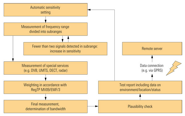 由于天線之間可以組合(相互之間、與地面之間已解耦,低頻范圍為全向環形天線,高頻范圍為全向電場天線),因而設備不必在測試現場進行校準。R&S® ESPI 測試接收機負責執行測量,由于結合使用了預選器和前置放大器,因而可同時檢測強、弱信號。測量序列依靠 R&S® RFEX EMF 軟件的特殊功能處理,該軟件是成熟的便攜式電磁場測量系統R&S® TS-EMF的一部分。測量和分析由一系列步驟組成,并可不斷地重復(如圖所示)。儀器在測量整個頻率范圍之前,首先自動地調整靈敏度以防止發生過載,各頻率子范圍可選擇不同的設置。為了確保各子頻率信號的測量,必要時可提高靈敏度重新進行測量。為了準確地對此類復雜信號進行加權處理,需對重新定義的無線電業務(具有合適的帶寬和特定設置)進行測量。信號經評估和數據精簡處理后通過帶寬檢查其合理性,測量結果會隨同環境和系統狀態數據一并發送,后續詳細分析時需要的中間步驟和原始數據則可以存儲在本地硬盤上。